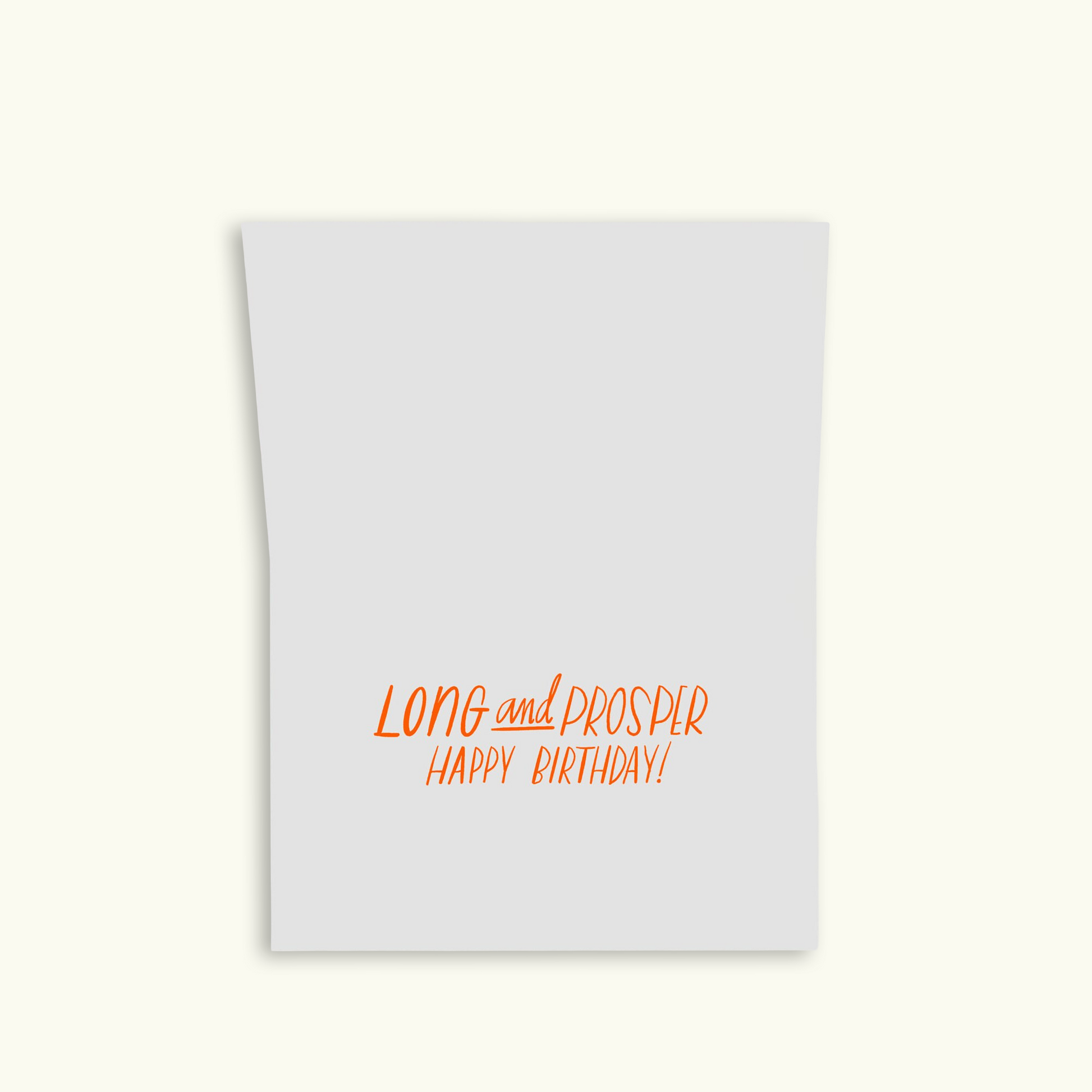 Inside of the card in orange handwritten lettering: "Long and Prosper; Happy Birthday!"