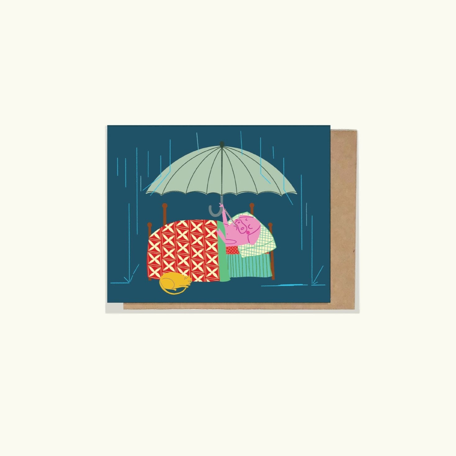 An Adorable ill pig holding an open umbrella over his bed while the rain is coming down. There is a yellow cat seeking shelter next to the bed under the umbrella as well. The inside of this card reads as "Feeling Under The Weather? Get Well Soon"!