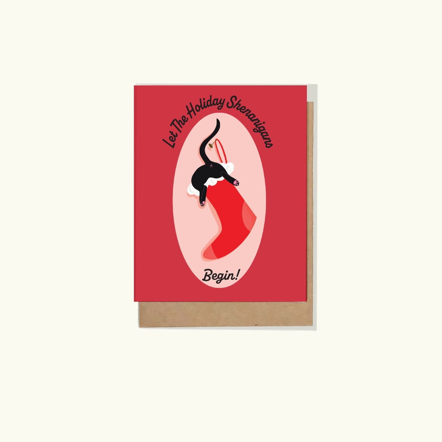 This humorous holiday card has an illustration of a black cat buried in a red stocking nose first with his behind and tail in full view. Such a bad cat, that is always up to some very naughty behavior. The front of the greeting cards states...